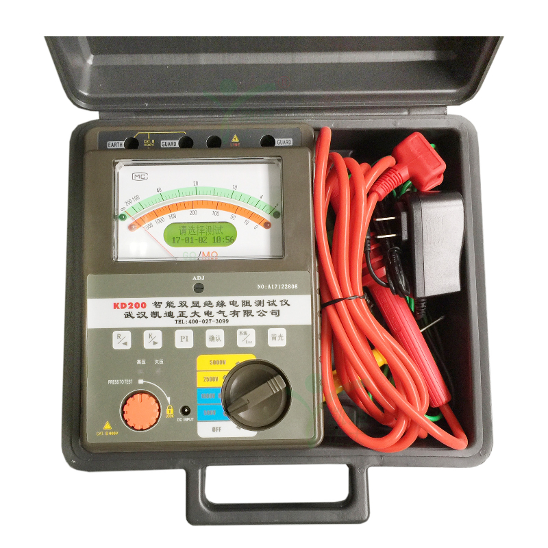 武漢凱迪正大電氣有限公司專業(yè)生產的KD200系列型智能雙顯絕緣電阻測試儀采用嵌入式工業(yè)單片機實時操作系統(tǒng),薄形張絲表頭與圖形點陣液晶顯示器較好結合,KD200系列表具有多種電壓輸出等級(500V、1000V、2500V、5000V)、容量大、抗干擾強、指針與數(shù)字同步顯示、交直流兩用、操作簡單、自動計算各種絕緣指標(吸收比、極化指數(shù))、各種測量結果具有防掉電功能等特點。是測量大容量變壓器、互感器、發(fā)電機、高壓電動機、電力電容、電力電纜、避雷器等絕緣電阻的測試儀器。