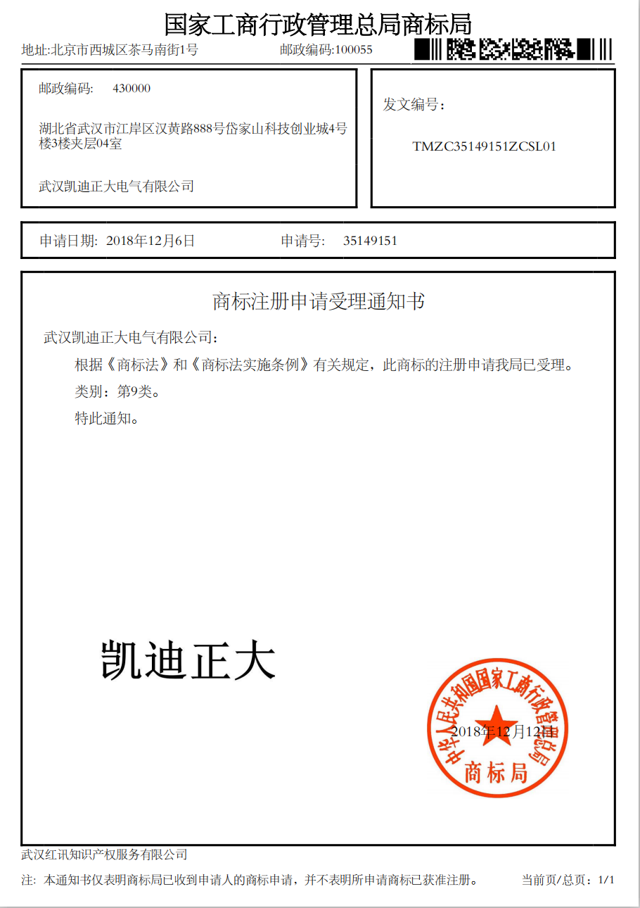 ![]() “凱迪正大”國家工商行政總局商標局受理書 |