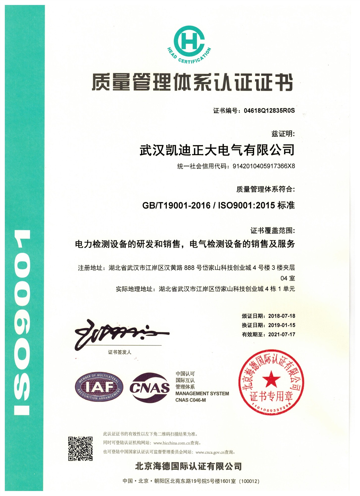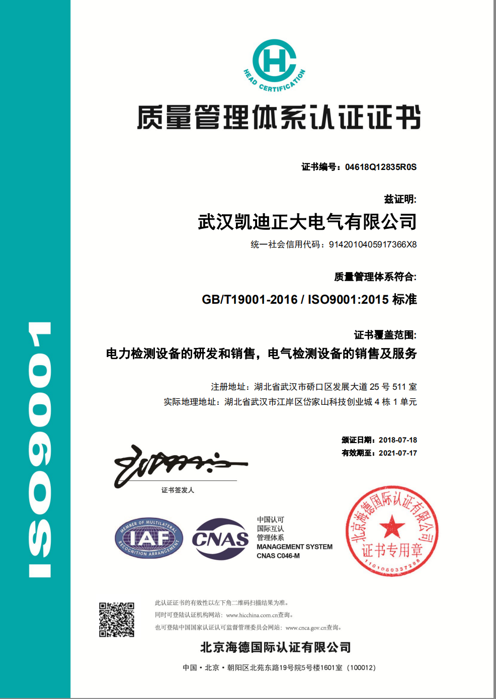 ![]() 中國合格評定國家認可委員會-凱迪正大證書 |