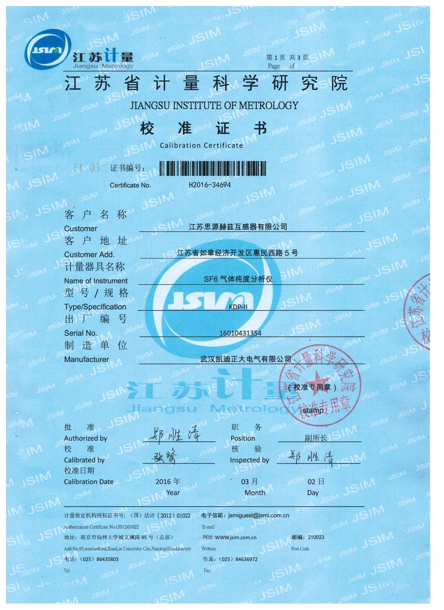 ![]() 江蘇省計量科學(xué)研究院-SF純度分析儀校準證書 |