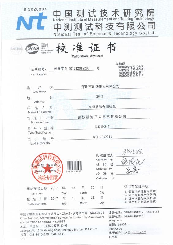 ![]() 中國測試技術(shù)研究院-KDHG互感器儀校準證書 |