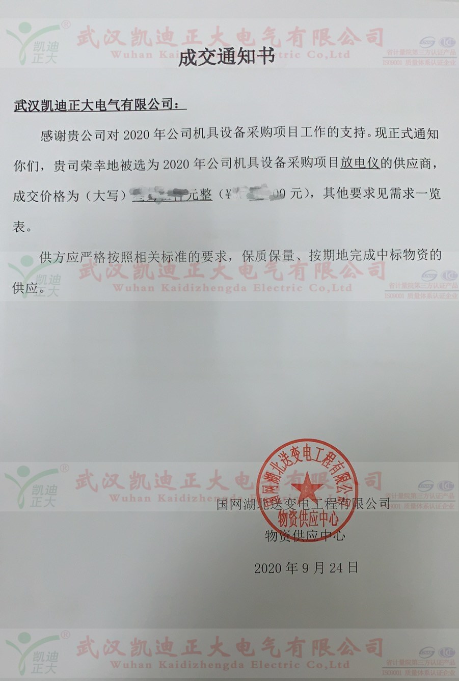 祝賀獲得國(guó)網(wǎng)湖北送變電公司蓄電池放電儀成交通知書(shū)