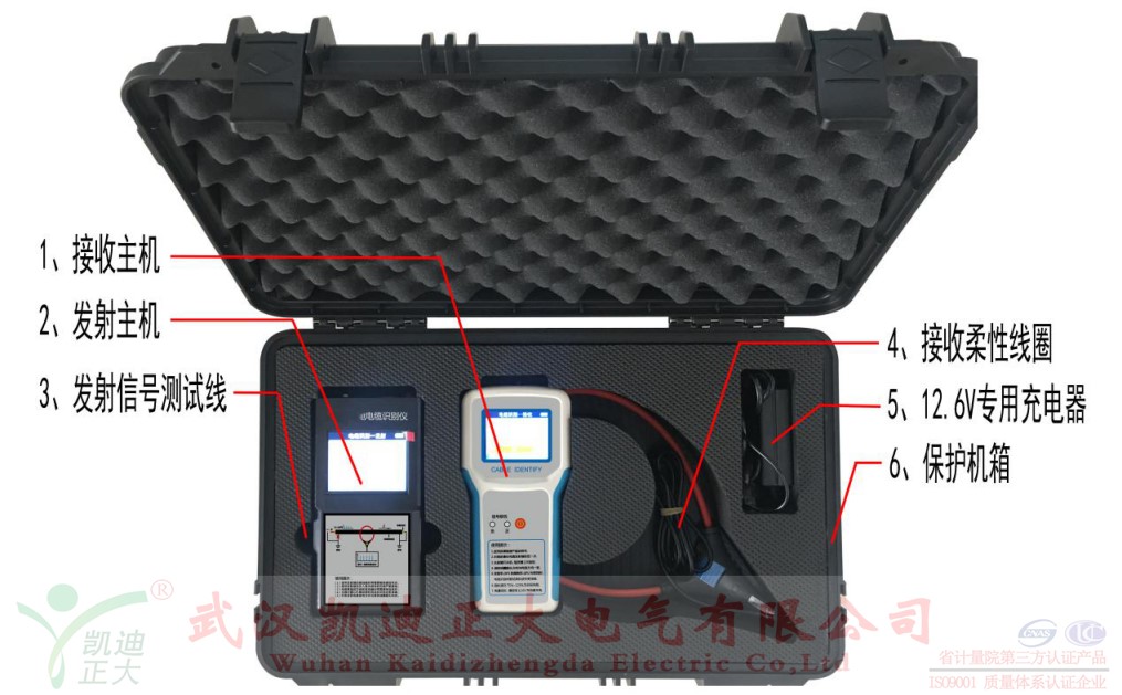 KD-214A帶電電纜識別儀(以下簡稱識別儀)是用于將某一特定電纜從一束電纜中識別出來的專用儀器。它即能識別停電電纜,也能識別帶電電纜,滿足了電力施工現(xiàn)場對電纜識別的多重需求。識別儀主要由發(fā)射主機、接收主機、發(fā)射連線、發(fā)射卡鉗與柔性測量線圈構(gòu)成。識別儀的設(shè)計相比上一代產(chǎn)品更加緊湊小巧,攜帶方便,具有如下特點: