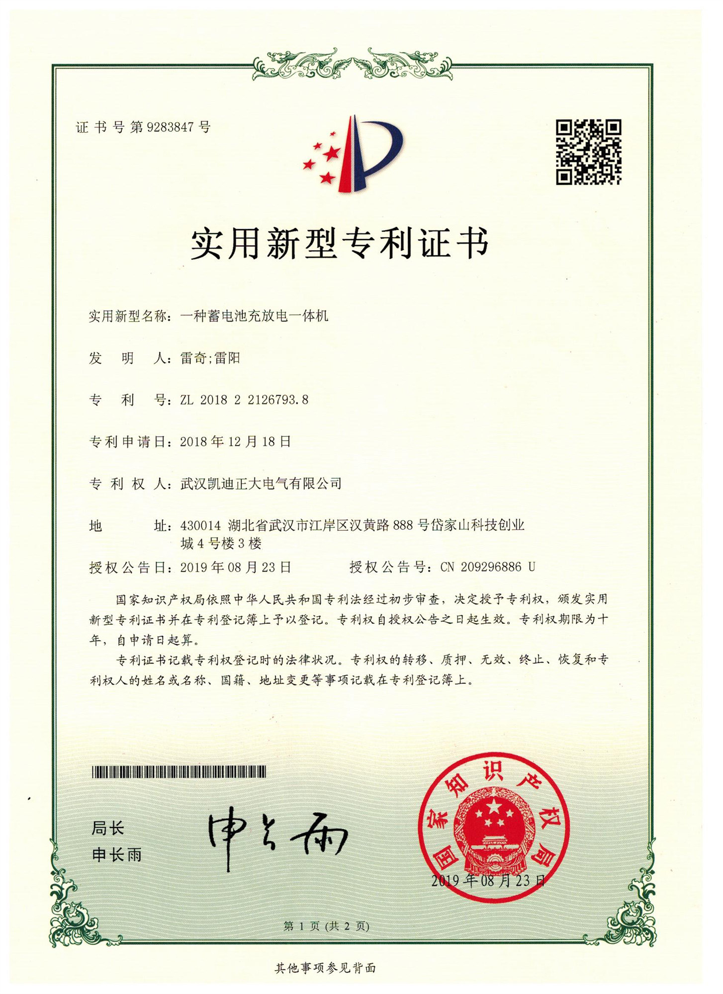 KDZD886蓄電池充放電一體機(jī)專利,一種用于蓄電池充放電一體機(jī),證書號(hào)第:9283847號(hào)。專利號(hào):ZL 2018 2 2126738.8 專利權(quán)人:武漢凱迪正大電氣有限公司