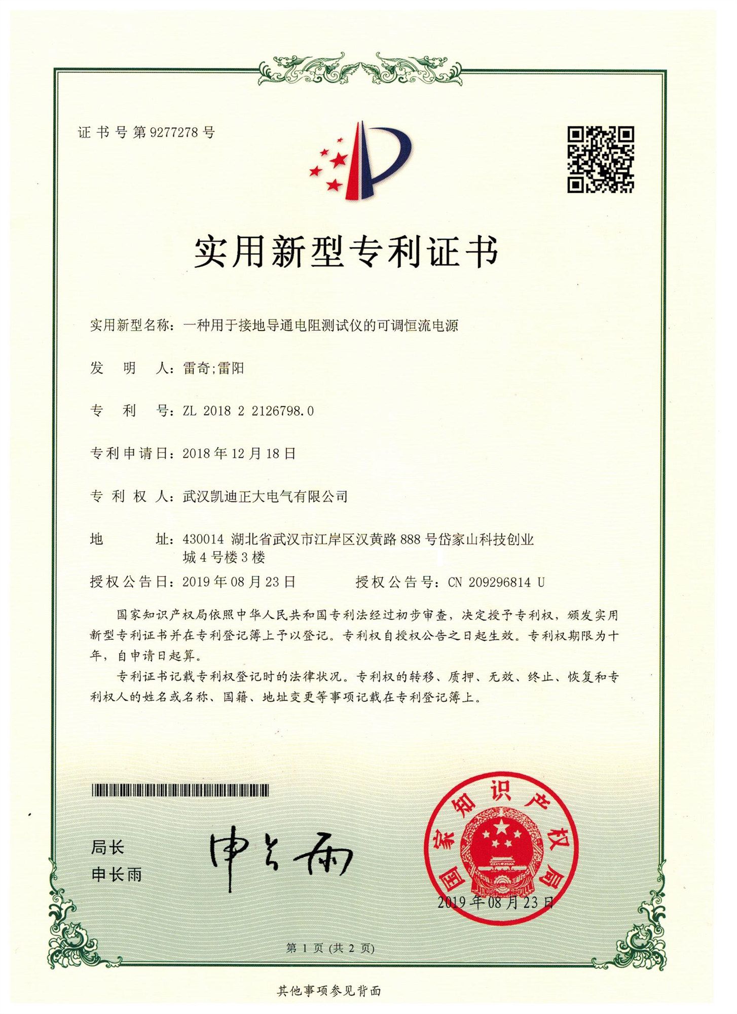 KDDT-10A接地引下線導(dǎo)通測(cè)試儀專利,一種用于接地導(dǎo)通電阻測(cè)試儀的可調(diào)恒流電源,證書號(hào)第:9277278號(hào)。專利號(hào):ZL 2018 2 2126798.0 專利權(quán)人:武漢凱迪正大電氣有限公司