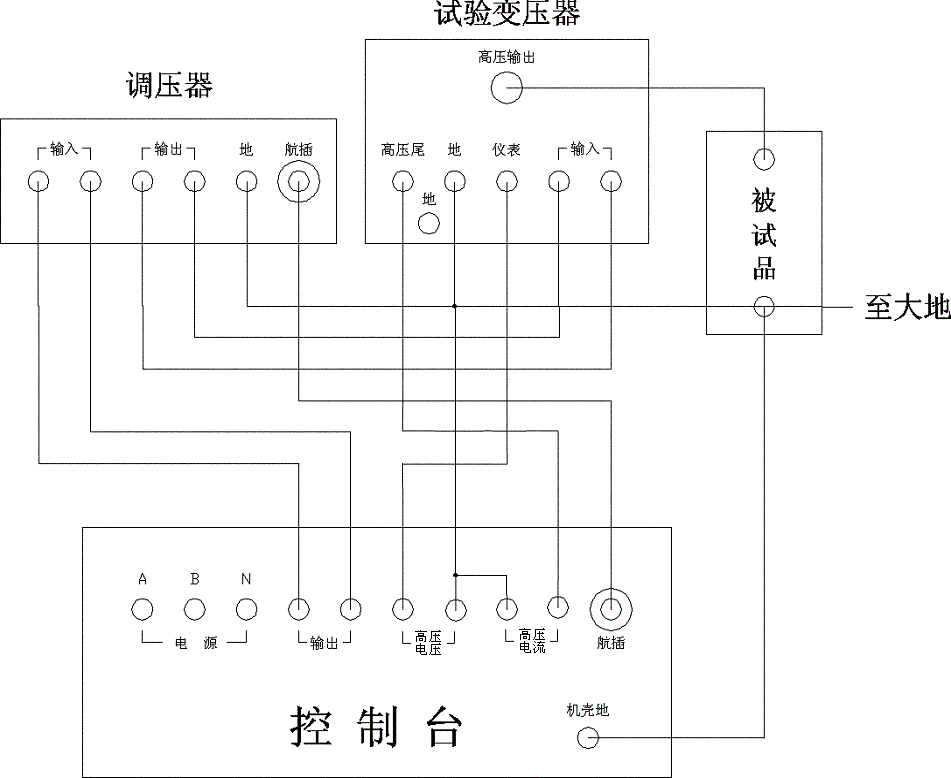 交流試驗變壓器:將工頻兩相380V電源接入TCWJH電動控制臺,經(jīng)調(diào)壓器調(diào)節(jié)0~400V電壓輸入至試驗變壓器初級繞組,根據(jù)電磁感應原理,在次級繞組可得到可調(diào)的工頻電壓。