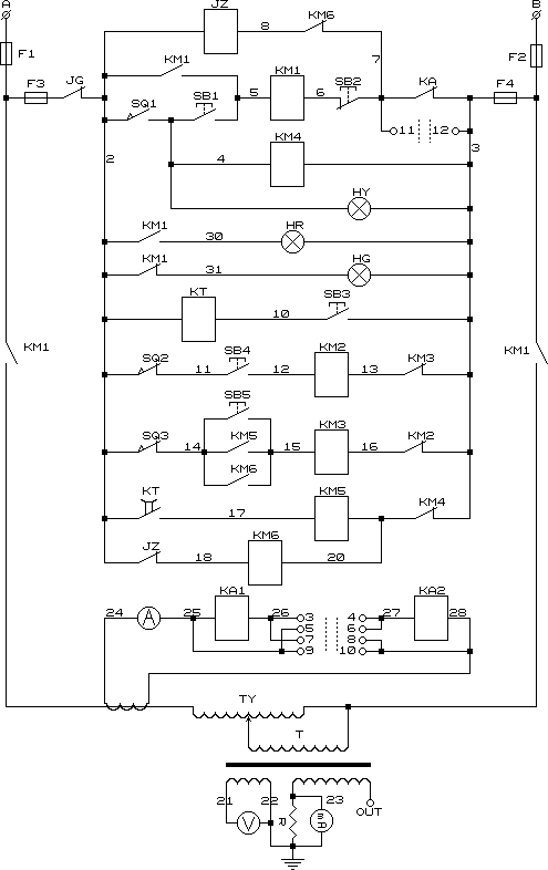 f)在升壓或耐壓過程中,如發(fā)生短路、閃絡擊穿等過流時,過流繼電器(-KA)動作,切斷主回路,調(diào)壓器自動回零,表示被試品不合格。需要指出的是在耐壓過程中出現(xiàn)過流的情況,調(diào)壓器自動回零的同時應及時按下“計時”按鈕切除過流繼電器。