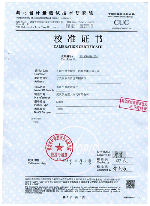武漢凱迪正大KDYDJ高壓交直流試驗(yàn)儀校準(zhǔn)證書