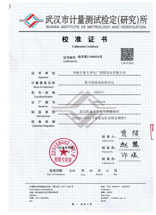 武漢凱迪正大KD2571數(shù)字接地電阻測試儀校準(zhǔn)證書