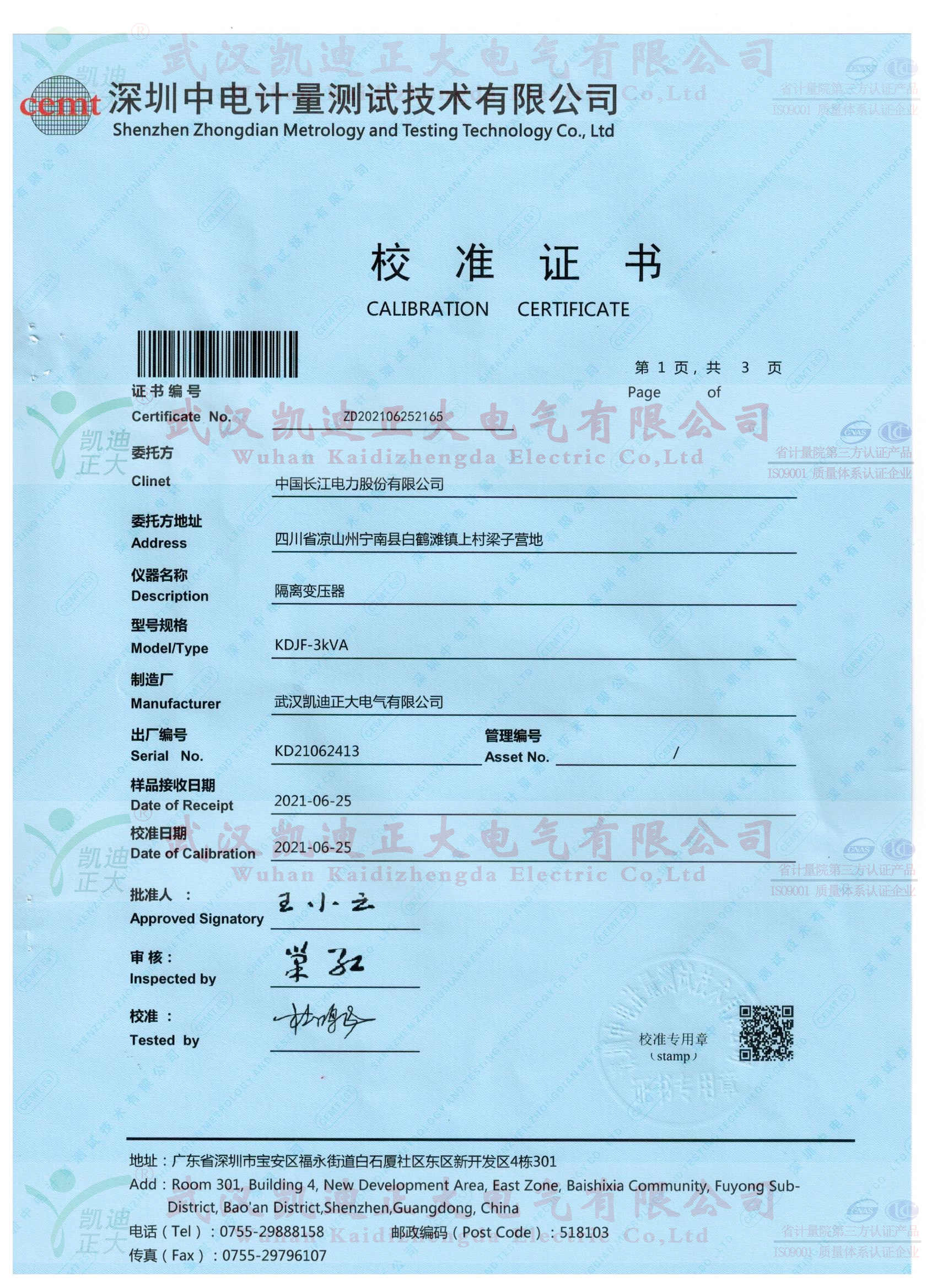 中國(guó)長(zhǎng)江電力采購(gòu)隔離變壓器獲得中電計(jì)量校準(zhǔn)證書(shū)