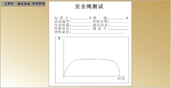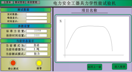 參數(shù)設(shè)置。這里要特別查看(當(dāng)前狀態(tài)顯示)的內(nèi)容,確認(rèn)是否是自動(dòng)模式,傳感器是否符合試驗(yàn)的量程,還有是否是拉力測(cè)試,確認(rèn)無誤后再做下面的事情;清零按鈕用于清除初始值。然后點(diǎn)擊確認(rèn)測(cè)試按鈕開始測(cè)試,但系統(tǒng)力值到達(dá)設(shè)定值的20%時(shí),系統(tǒng)會(huì)自動(dòng)停止,此過程為預(yù)緊過程,若此過程有出現(xiàn)較大的變動(dòng),可能由于夾具沒夾緊,此時(shí)試驗(yàn)人員可根據(jù)具體的現(xiàn)象進(jìn)行檢查,若沒有問題試驗(yàn)人員用鼠標(biāo)點(diǎn)擊繼續(xù)測(cè)試,設(shè)備繼續(xù)加載力值,測(cè)試數(shù)據(jù)欄中會(huì)顯示當(dāng)前狀態(tài)的受力情況,當(dāng)拉力力值達(dá)到設(shè)置的力值時(shí),開始自動(dòng)計(jì)時(shí),設(shè)備開始保持力,力值不過沖。同時(shí)右邊的實(shí)時(shí)曲線將記錄實(shí)時(shí)力值與時(shí)間的曲線。計(jì)時(shí)完成后設(shè)備自動(dòng)卸載力,關(guān)閉電磁閥,關(guān)閉油泵,測(cè)試結(jié)束。鼠標(biāo)點(diǎn)擊進(jìn)入報(bào)表按鈕進(jìn)入報(bào)表界面。