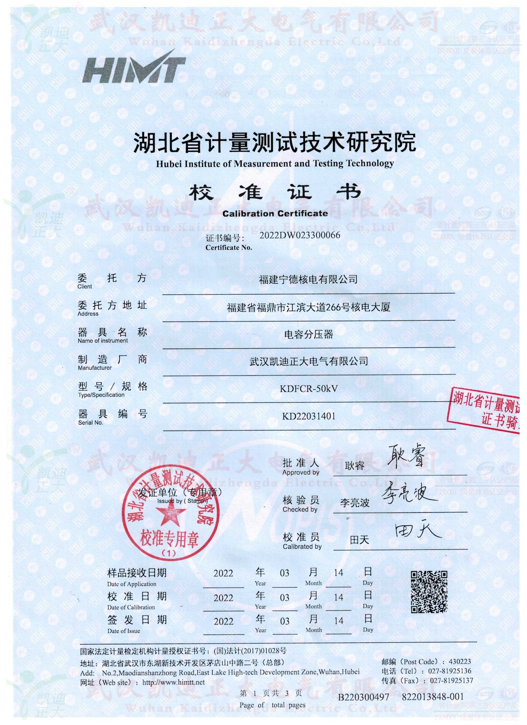我司自成立以來(lái)多次獲得中廣核核電訂單,這次是福建寧德核電站采購(gòu)KDFCR-50kV電容分壓器、KDQX-50kV保護(hù)球隙、50kV高壓試驗(yàn)用電纜等設(shè)備一批。應(yīng)要求供應(yīng)設(shè)備需要獲得湖北省計(jì)量測(cè)試研究院的檢定合格證書(shū)。