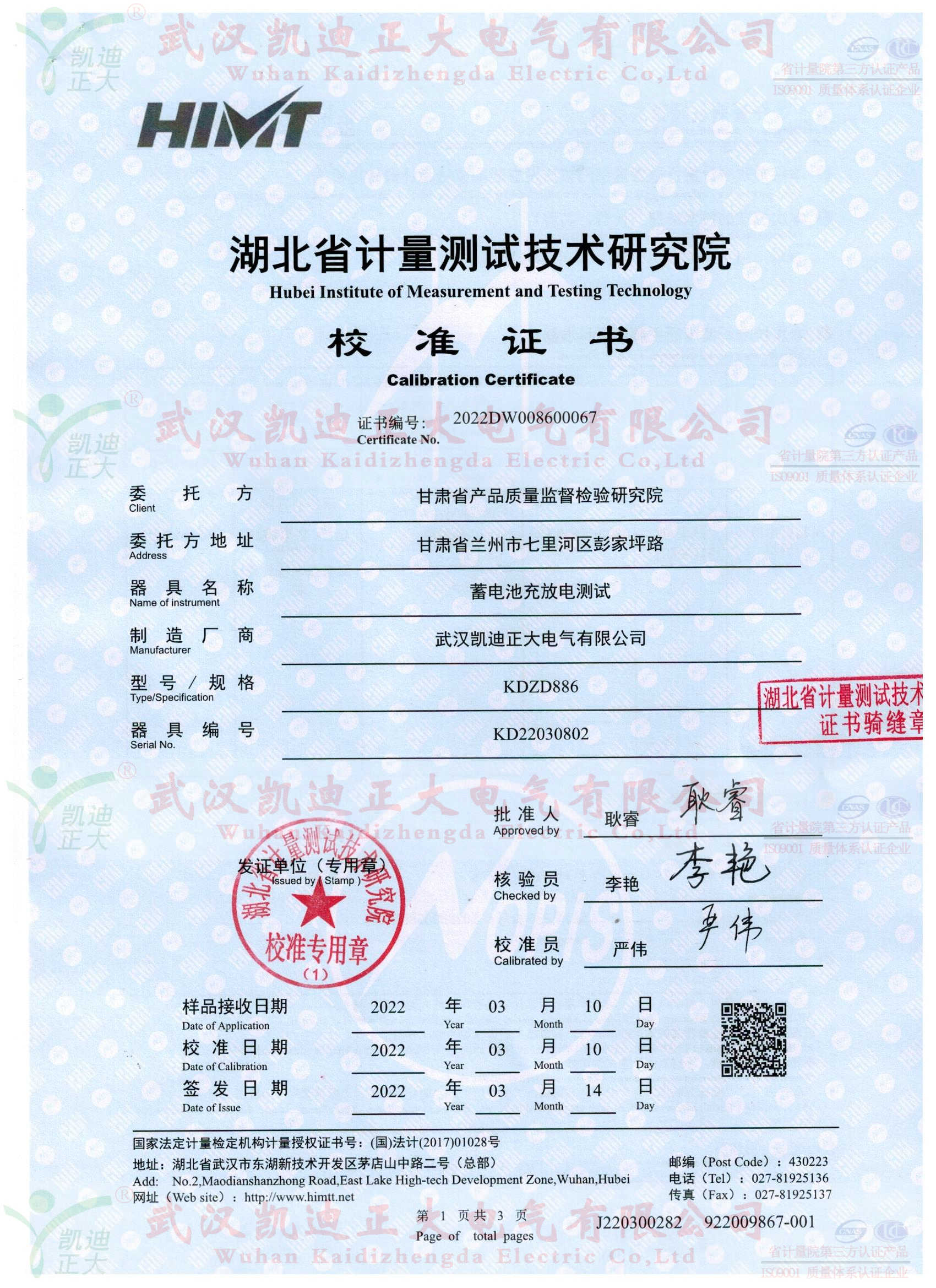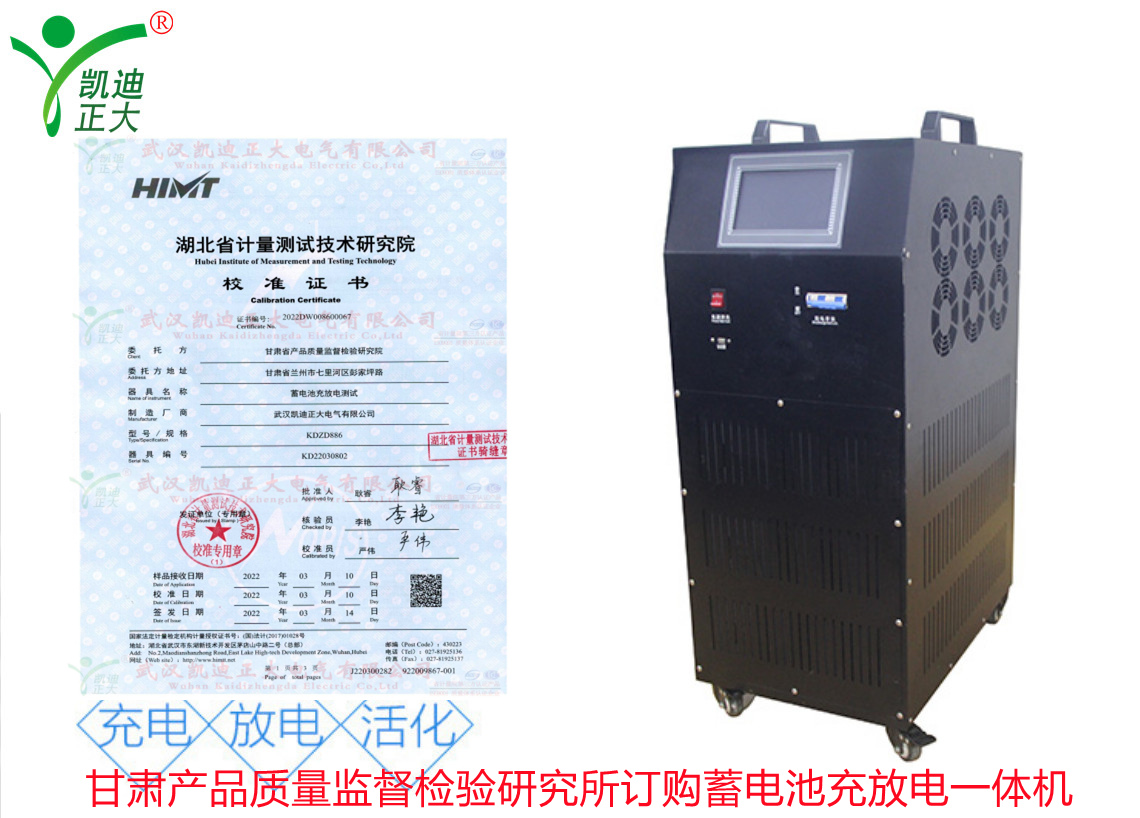 甘肅省產(chǎn)品質(zhì)量監(jiān)督檢驗(yàn)研究院在了解我司KDZD886蓄電池充放電測(cè)試儀集蓄電池恒流放電,智能充電,活化于一體等功能。隨即采購KDZD886蓄電池充放電測(cè)試儀,要求獲得湖北省計(jì)量測(cè)試技術(shù)研究院的檢定合格報(bào)告。