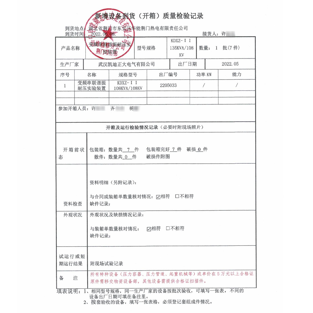 2022年6月初,華能荊門(mén)熱電有限公司采購(gòu)凱迪正大電氣一批熱電廠電氣試驗(yàn)設(shè)備,其中KDXZ-135kvA/108kV變頻串聯(lián)諧振耐壓試驗(yàn)裝置已經(jīng)順利到貨,實(shí)發(fā)數(shù)量7件,實(shí)收數(shù)量7件。由中國(guó)電建湖北運(yùn)維檢修公司荊門(mén)項(xiàng)目部許工負(fù)責(zé)驗(yàn)收,火紅的電抗器顏色格外顯眼。許工和齊工一起對(duì)設(shè)備進(jìn)行清點(diǎn),仔細(xì)對(duì)比了湖北省計(jì)量院出具的計(jì)量檢測(cè)報(bào)告,對(duì)比現(xiàn)場(chǎng)升壓試驗(yàn)精度,表示認(rèn)可滿意。