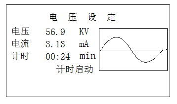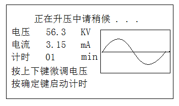 自檢成功后,儀器自動(dòng)進(jìn)入升壓狀態(tài)。儀器將用若干個(gè)周期的時(shí)間(幾分鐘)將電壓升至設(shè)定值。在升壓過(guò)程中,按停機(jī)鍵,儀器將切斷電壓輸出,回到開(kāi)始畫(huà)面。當(dāng)升壓值接近設(shè)定值時(shí)出現(xiàn)圖7