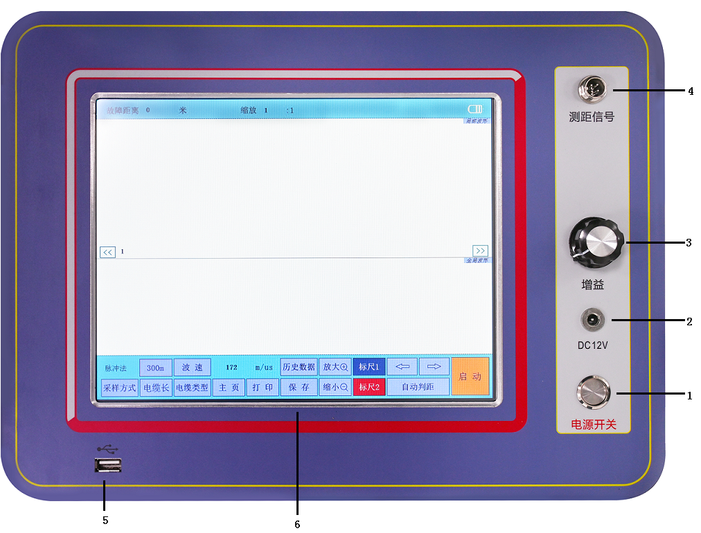 4、測(cè)距端口:測(cè)量電纜故障點(diǎn)距離時(shí),從該端口發(fā)出信號(hào)。