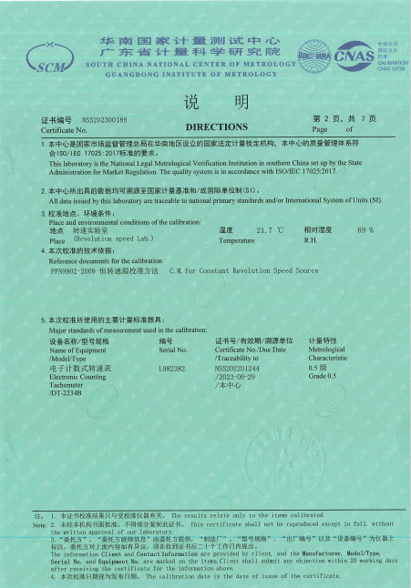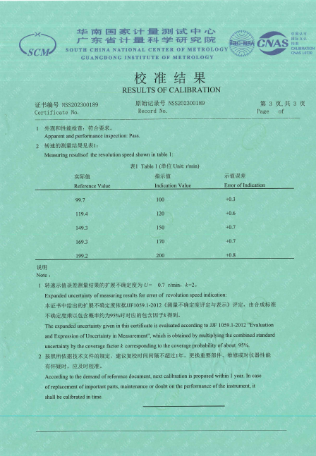 參照FFN9902-2009 恒轉(zhuǎn)速源校準(zhǔn)方法 C.M.for Constant Revolution Speed Source 檢定要求,CY3恒速器(恒轉(zhuǎn)速源)獲得NSS202300189檢定證書(shū)。