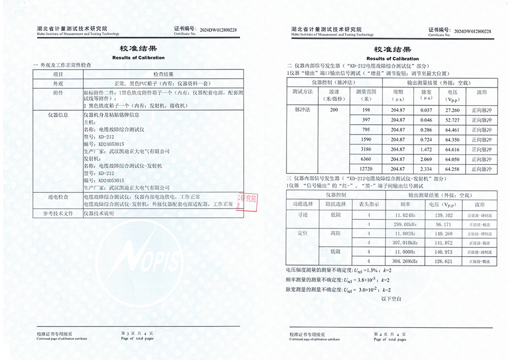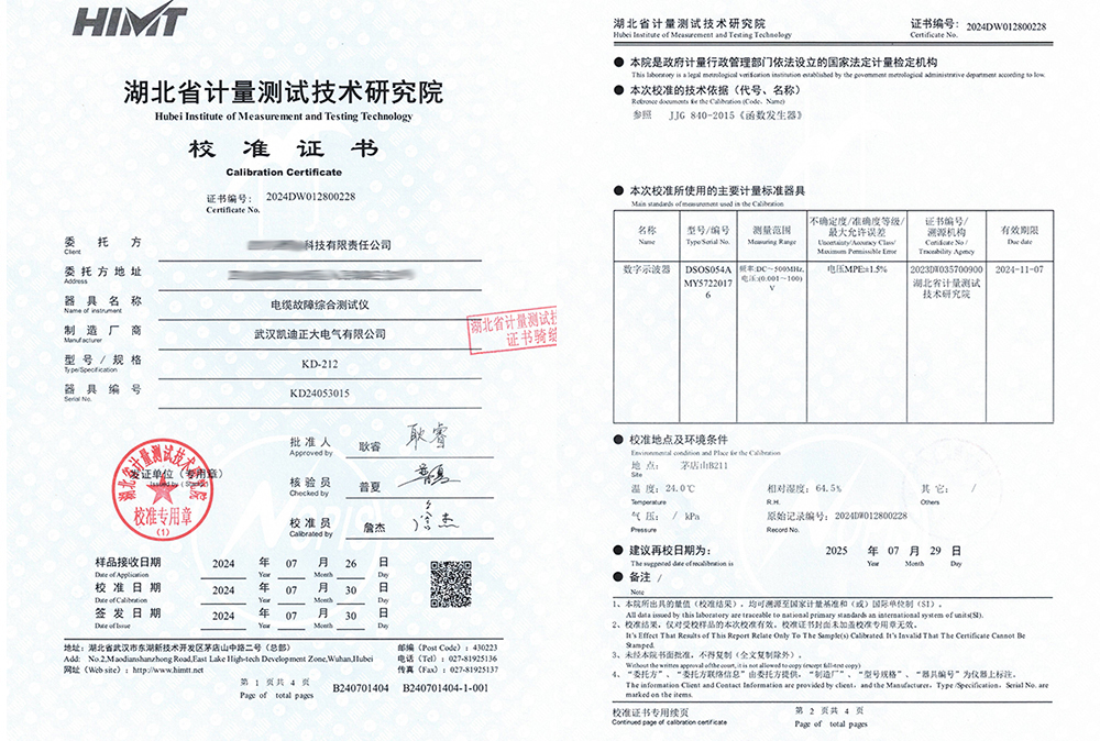值得強(qiáng)調(diào)的是,KD-212電纜故障綜合測試儀不僅贏得了河北地震局認(rèn)可,還順利通過了湖北省計量測試技術(shù)研究院的嚴(yán)格檢測,獲得了校準(zhǔn)證書,這再次證明了其技術(shù)水平和測量結(jié)果的準(zhǔn)確性。