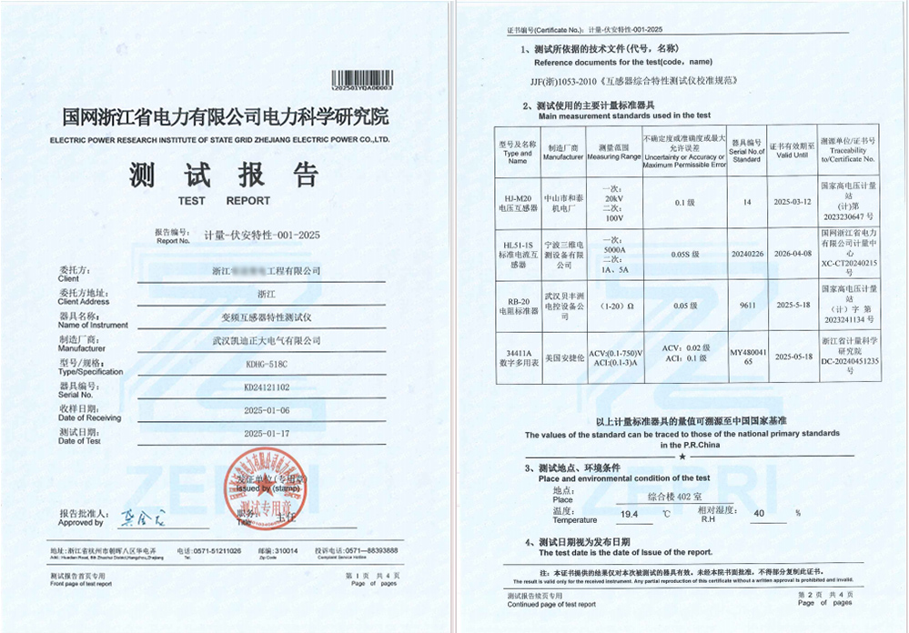 校準(zhǔn)圍繞對儀器的變比精度、角差控制、伏安特性曲線擬合度等核心指標(biāo)進行了多場景模擬測試。KDHG-518C變頻互感器特性測試儀具有操作簡便、功能全面、測試精準(zhǔn)等特點,廣泛應(yīng)用于各類CT(電流互感器)和PT(電壓互感器)的性能測試。此次通過國網(wǎng)浙江省電力有限公司電力科學(xué)研究院的校準(zhǔn),充分證明了KDHG-518C在技術(shù)指標(biāo)、測試精度和穩(wěn)定性等方面的可靠表現(xiàn)。