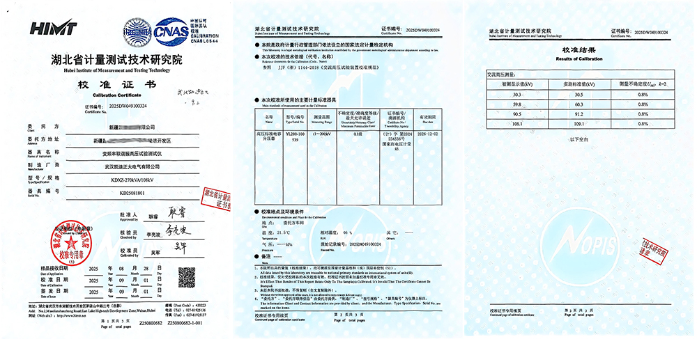 近期,新疆某能源公司采購了由‌武漢凱迪正大電氣有限公司生產(chǎn)的‌KDXZ-270kVA/108kV變頻串聯(lián)諧振試驗(yàn)裝置。該設(shè)備經(jīng)湖北省計(jì)量測試技術(shù)研究院(省計(jì)量院)校準(zhǔn)并頒發(fā)證書(證書編號:2025DW049100324),此次校準(zhǔn)不僅標(biāo)志著該設(shè)備各項(xiàng)性能指標(biāo)符合行業(yè)規(guī)范要求,更凸顯了武漢凱迪正大在高壓電氣檢測設(shè)備領(lǐng)域的技術(shù)實(shí)力。