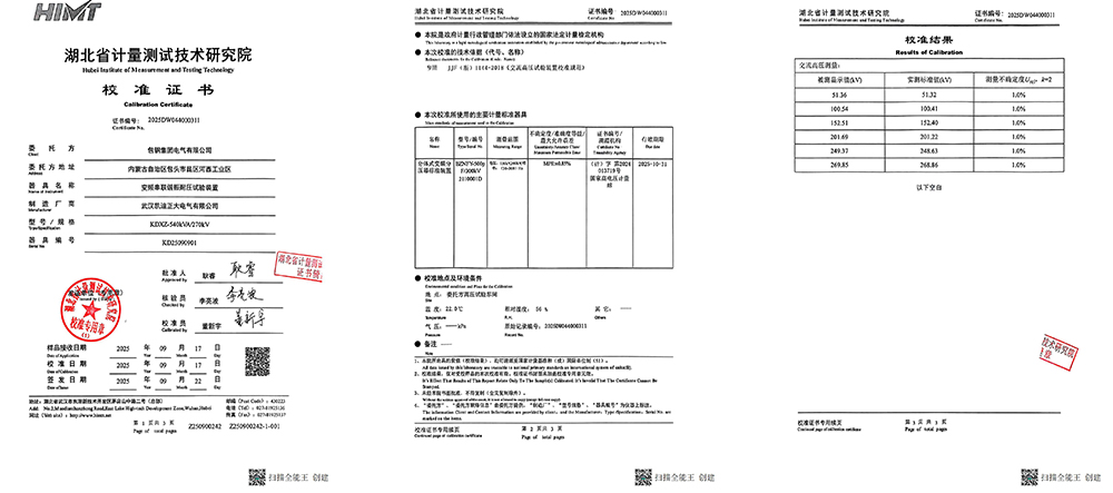 本次校準(zhǔn)由湖北省計量測試技術(shù)研究院執(zhí)行,該校是政府依法設(shè)立的法定計量檢定機構(gòu),具備國家認可的校準(zhǔn)資質(zhì)與溯源能力。校準(zhǔn)過程嚴(yán)格依據(jù)JJF(浙)1144-2018《交流高壓試驗裝置校準(zhǔn)規(guī)范》進行,確保了技術(shù)方法的規(guī)范性與結(jié)果的可比性。