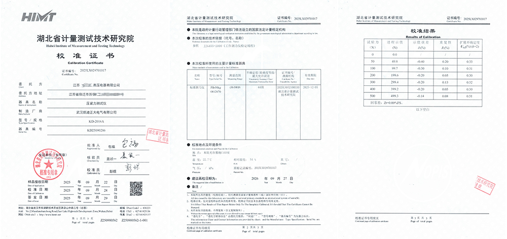 為確保測(cè)量數(shù)據(jù)的準(zhǔn)確性和可靠性,客戶要求將采購(gòu)的KD-2016A壓緊力測(cè)試儀送至湖北省計(jì)量測(cè)試技術(shù)研究院進(jìn)行校準(zhǔn)。校準(zhǔn)證書(shū)編號(hào)為2025LX029701017,由該院權(quán)威出具,確保了設(shè)備的量值溯源至國(guó)家計(jì)量基準(zhǔn)和國(guó)際單位制(SI)。