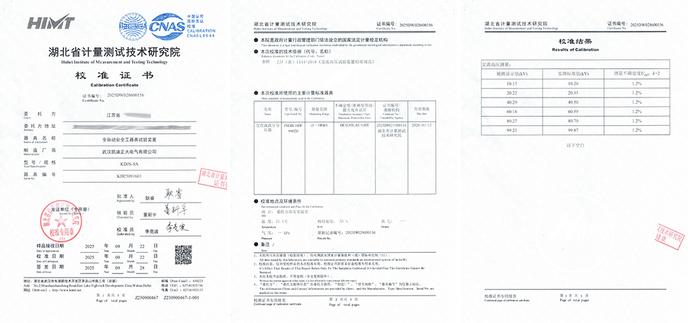 江蘇某灌溉單位采購武漢凱迪正大KDJS-8A型全自動(dòng)安全工器具試驗(yàn)裝置,經(jīng)湖北省計(jì)量測試技術(shù)研究院嚴(yán)格校準(zhǔn),取得了編號(hào)為2025DW028600156的校準(zhǔn)證書。